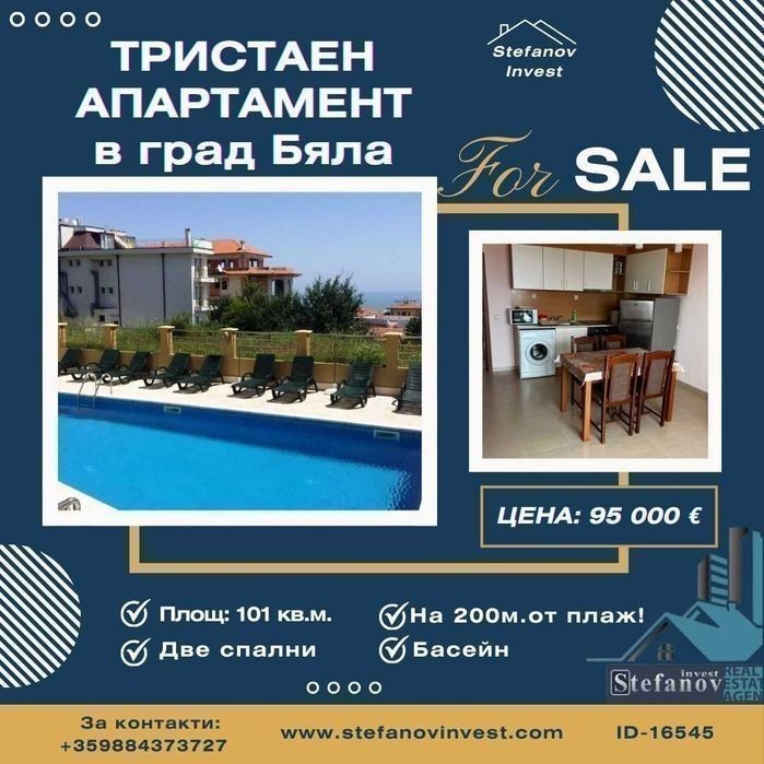 ЕКСКЛУЗИВНО! На 200 метра от плажа ! ОБЗАВЕДЕН! ГАРАНТИРАН ДОХОД ОТ ЛЕТНИЯ СЕЗОН! КОД: 16015. Предлагаме Ви тристаен апартамент в комплекс, разположен на 200 метра от плажа, в прекрасното градче Бяла. Ваканционният комплекс от "затворен тип", с изключителна морска панорама. Тристайният апартамент е разположен на трети жилищен етаж, с площ от 101 кв. м., включващи: входно антре, просторен дневен тракт, две спални, баня, тоалет и две тераси. Апартаментът се предлага напълно обзаведен, оборудван и климатизиран. На територията на комплекса има зона за релакс, с басейн и шезлонги. Открит паркинг за собствениците. Панорамен хидравличен асансьор. Сградата е в режим на Етажна Собственост. Всички въпроси по поддръжка на общи части и ремонт се решават от собствениците на общо събрание! Годишната такса за поддръжка на общите части е 540 лв./45 лв. на месец/. o Местоположение - ул. Хан Тервел №29, в близост до центъра на града o Разстояние до морето - 200 м. Закупуване на имот в гр. Бяла е: o печеливша инвестиция (ниски цени в сравнение с другите курорти) o подходящ за отдаване под наем с платформите- Airbnb и Booking. o възможност за спокойна семейна почивка съчетание на море и планина o възможност за целогодишно ползване (инфраструктурното развитие) За района: Бяла е древен град известен със своите плажове с мек, кадифен пясък обграден със зелени масиви широколистни гори, чиста вода и въздух, защото от тук започва билото на Стара планина. Бяла е известен винарски район. Вино, грозде и многото видове риби от този район привлича хората тук от най-древни времена. В града има яхтено пристанище любимо място на много чужденци за семейна почивка (предимно руски, британски и скандинавци). Най-близкият голям град и летище е Варна- 50км, Бургас- 70 км. Има развита инфраструктура в това число магазини, ресторанти, клиники, аптеки, банки и др. Градът граничи с природните резервати на "Кара дере" и "Камчия "