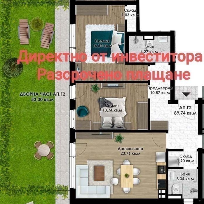 Среда на строителството! Директно от инвеститора! Без комисионна! Самостоятелен двор идеален за почивка, барбекю или детски кът. Спокойна среда и съвременна архитектура. Перфектна инвестиция или нов дом за семейството ви. Застроена площ: 89,74 кв. м Дворни площи: 53,30 кв. м Общи части: 14,16 кв. м Обща застроена площ: 103,90 кв. м Изложение: Юг и Изток Има възможност за закупуване на външно или вътрешно паркомясто!
